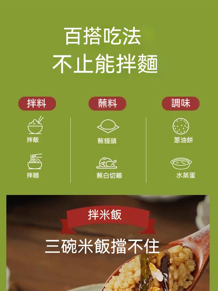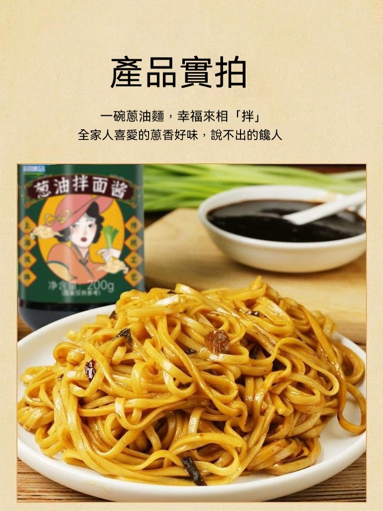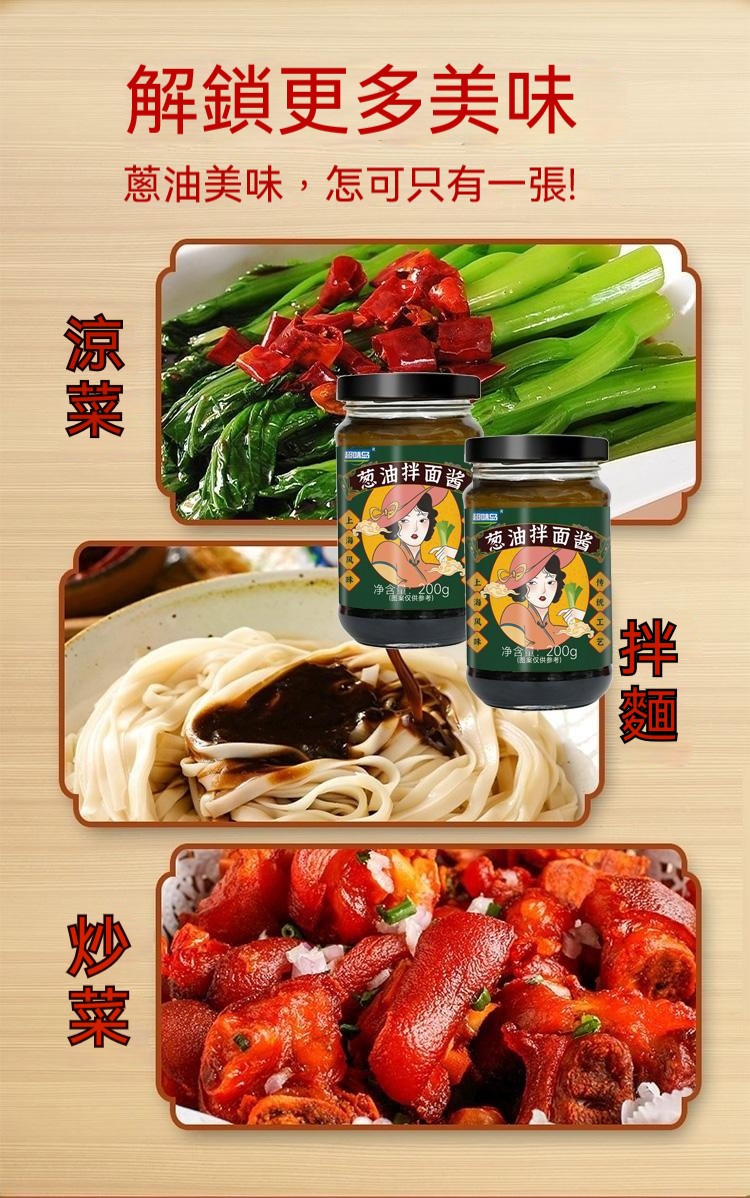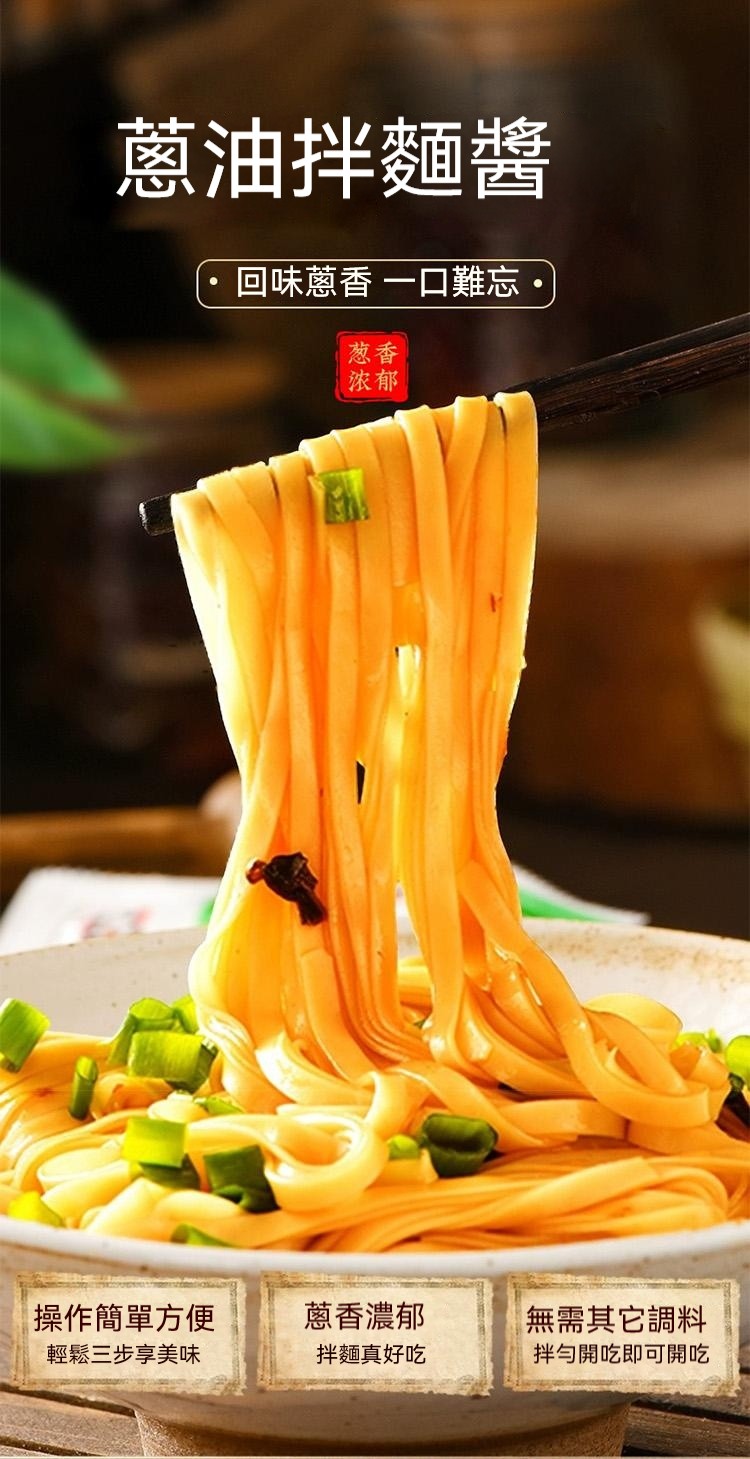 5分鐘前醇厚麵醬,完美搭配麵食,展現獨特風味 ,五分鐘就能吃上的蔥油拌面 ,無需繁瑣步驟 ,開瓶即食 油潤蔥香即刻享用 ,增鮮提香 ,秒變大廚 ,飯或者面都能一勺搞定 - 【98%客戶選擇】4入組-NT$1180