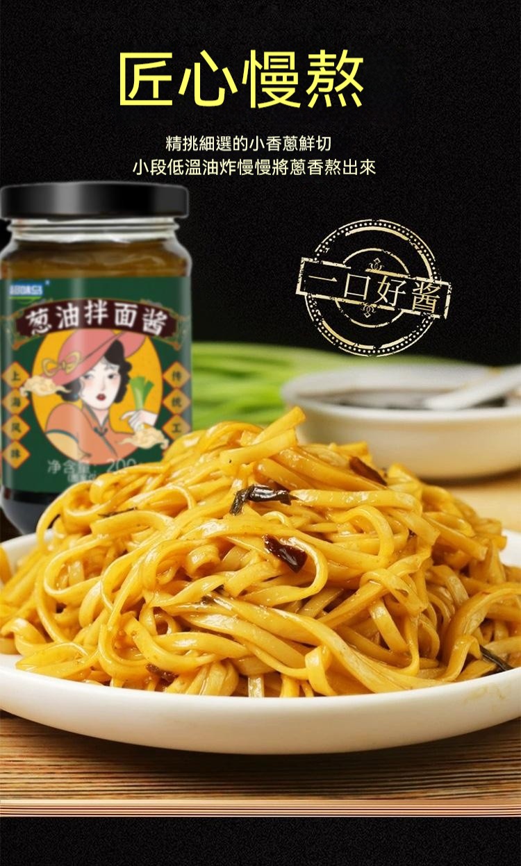 20分鐘前醇厚麵醬,完美搭配麵食,展現獨特風味 ,五分鐘就能吃上的蔥油拌面 ,無需繁瑣步驟 ,開瓶即食 油潤蔥香即刻享用 ,增鮮提香 ,秒變大廚 ,飯或者面都能一勺搞定 - 【體驗嘗鮮價】2入組-NT$980