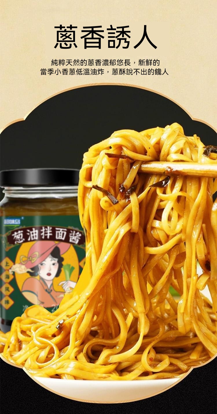 5分鐘前醇厚麵醬,完美搭配麵食,展現獨特風味 ,五分鐘就能吃上的蔥油拌面 ,無需繁瑣步驟 ,開瓶即食 油潤蔥香即刻享用 ,增鮮提香 ,秒變大廚 ,飯或者面都能一勺搞定 - 【體驗嘗鮮價】2入組-NT$980