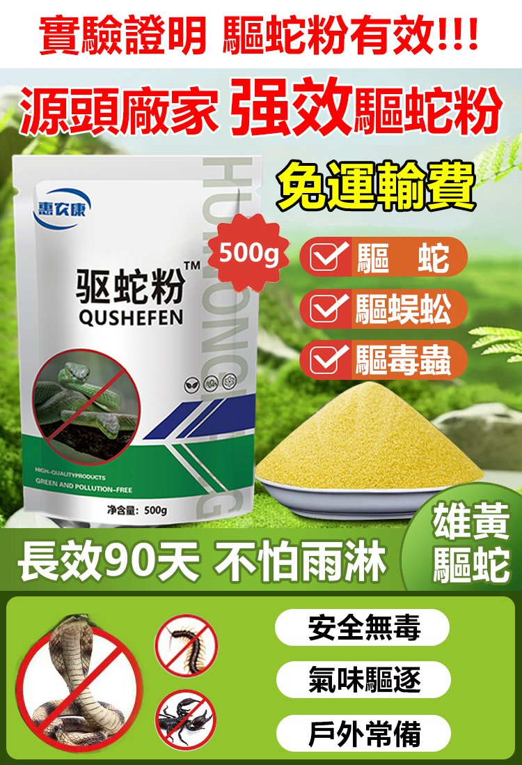 11分鐘前【强效驅蛇粉】千米内無蛇,不毒家禽, 保護家禽,驅蛇/驅蠍子/驅蜈蚣/驅毒蟲,一撒驅蛇蟲,時效可達90天,不怕雨淋 - 【破盤嗨購】買二送三 5入組 NT$-1498