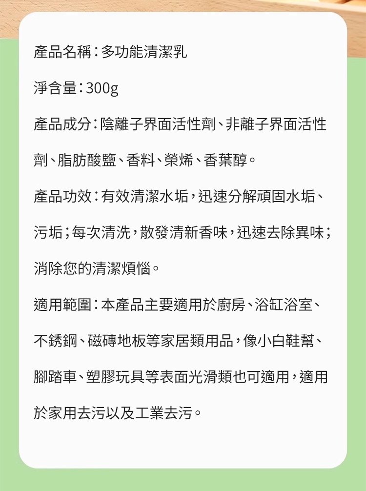 20分鐘前【太牛了!】日本多功能强效清潔乳,溫和不刺激! 火爆熱銷中!一噴一擦,強力去除水垢/油污/皂漬 - 【超夯活動】買一送二 3入組-NT$998
