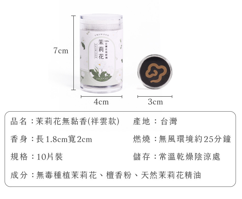 半小時前原木香 茉莉花無黏香 10g/ 20g 無粘香 祥雲香 食用級 無毒 花壇茉莉花 窨茶 薰香 擴香 開運 招財 濃縮10倍香氣 臥香 線香 無黏粉 獨家技術 - 茉莉花無黏香 祥雲款(10片裝)7罐