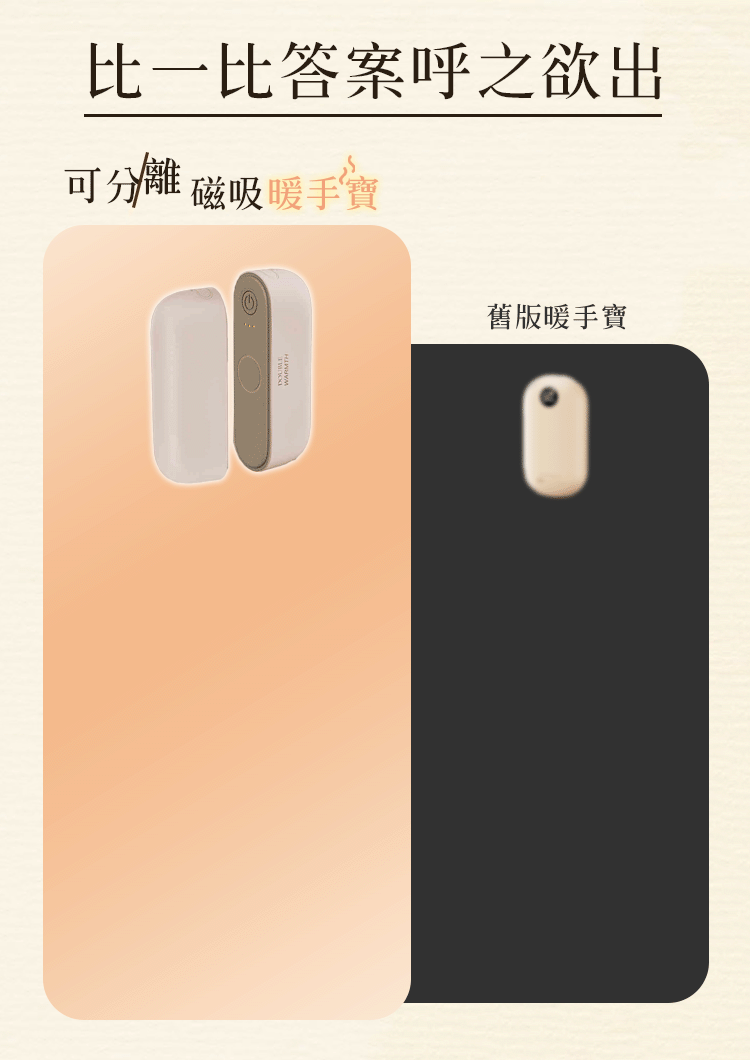 12分鐘前【口碑爆棚!冬天禦寒神器!!】磁吸暖手寶! 外套再厚手還是很冷!暖手過冬就靠它!!! 3秒瞬熱,迅速溫暖你的雙手!! 3檔調溫設計,隨心調你想要的溫度!! 磁吸組合設計,左右手分開使用不怕冷!! - 買一送一暖手寶 『2入組』僅需-NT$1088 均價NT$544