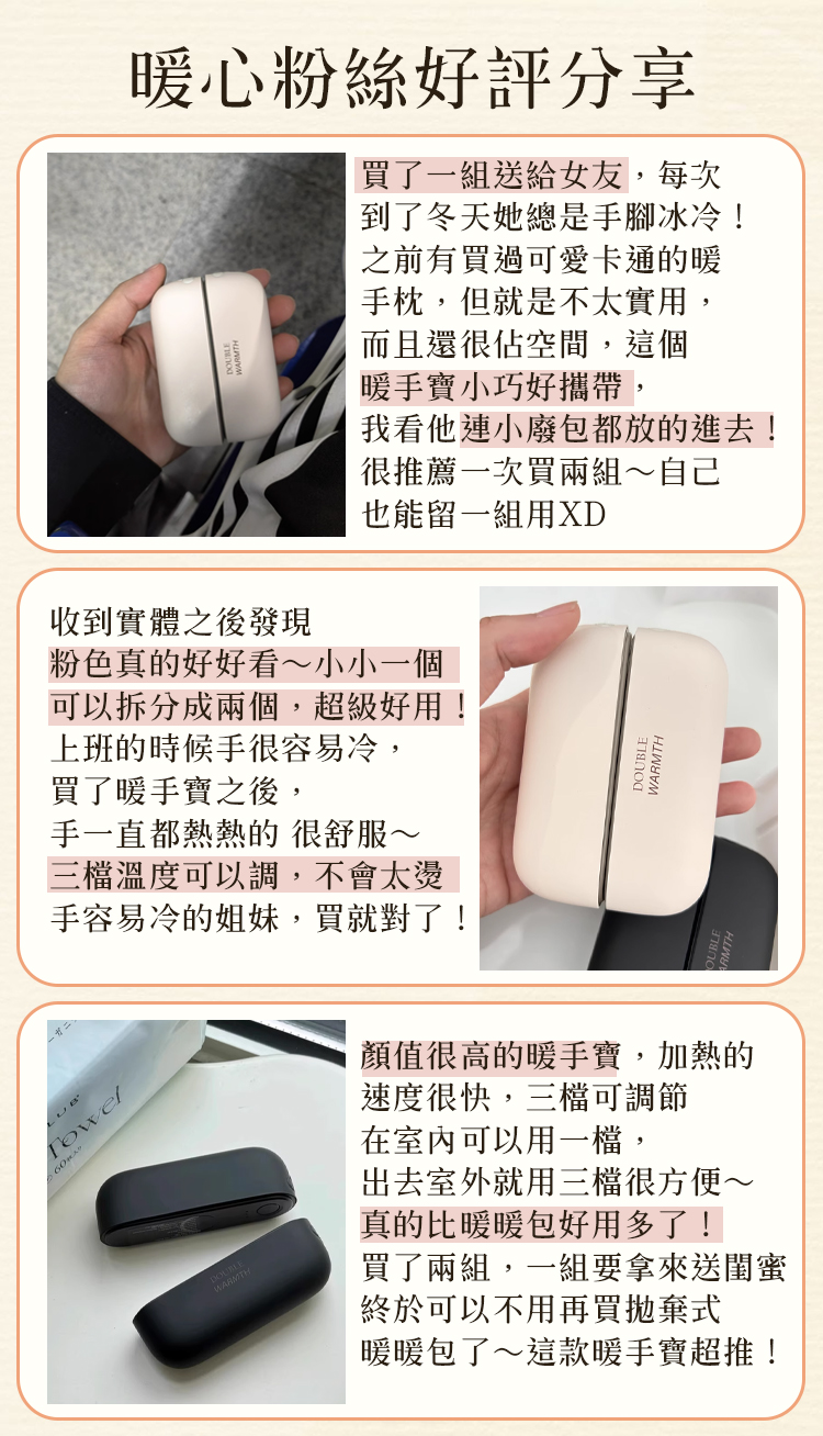 25分鐘前【口碑爆棚!冬天禦寒神器!!】磁吸暖手寶! 外套再厚手還是很冷!暖手過冬就靠它!!! 3秒瞬熱,迅速溫暖你的雙手!! 3檔調溫設計,隨心調你想要的溫度!! 磁吸組合設計,左右手分開使用不怕冷!! - 買二送二暖手寶 『4入組』僅需-NT$1488 均價NT$372